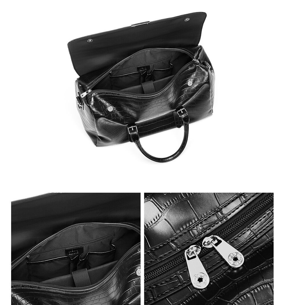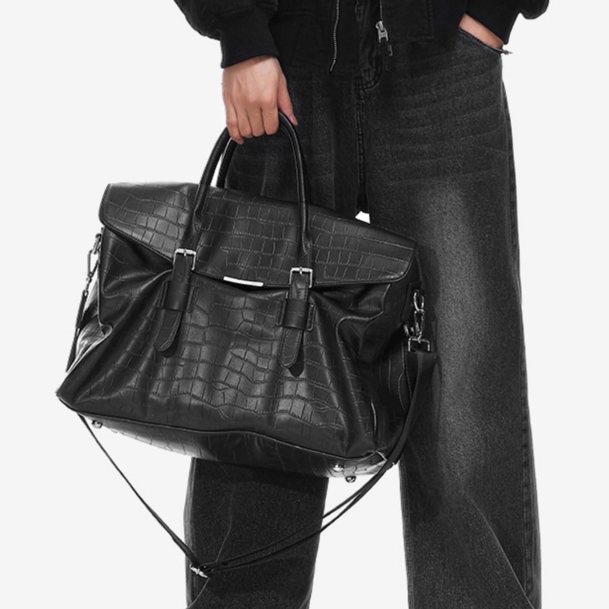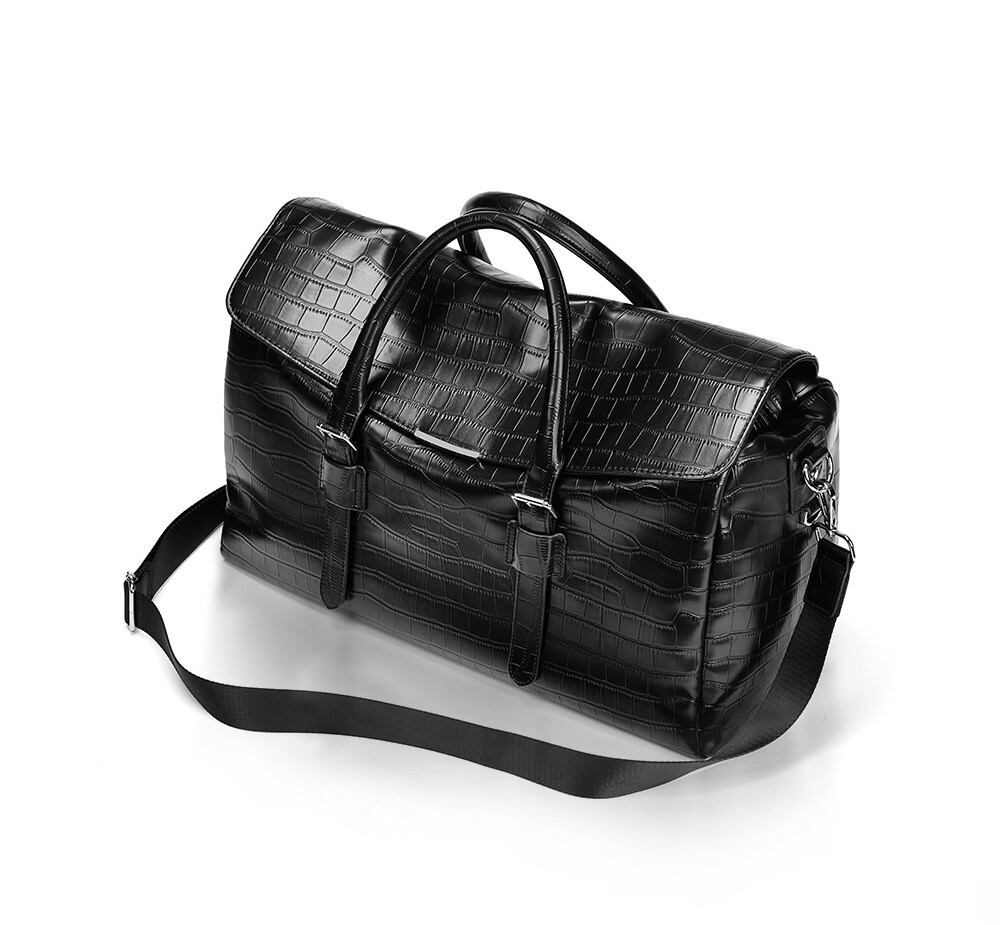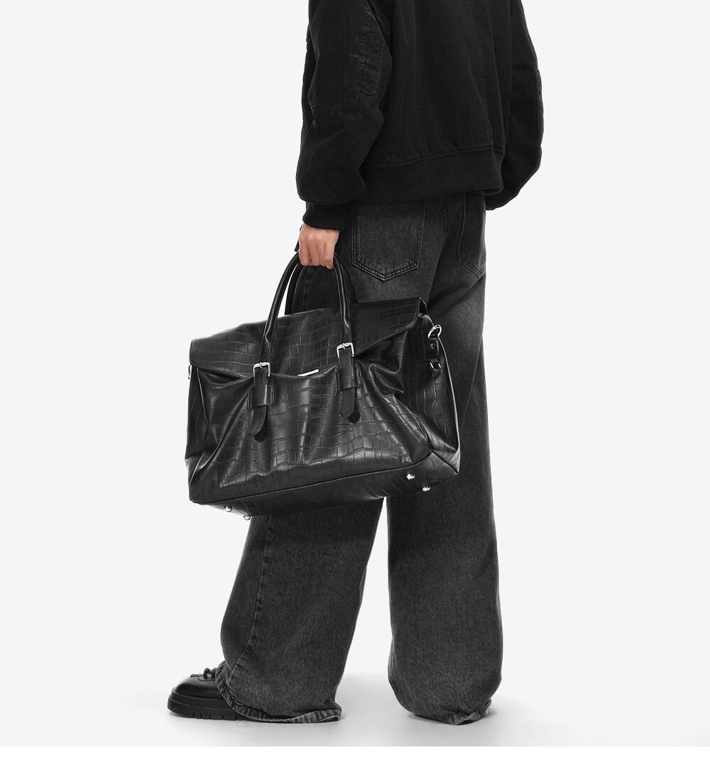 クロコダイル柄が目を引く、フェイクレザーのボストンバッグです。