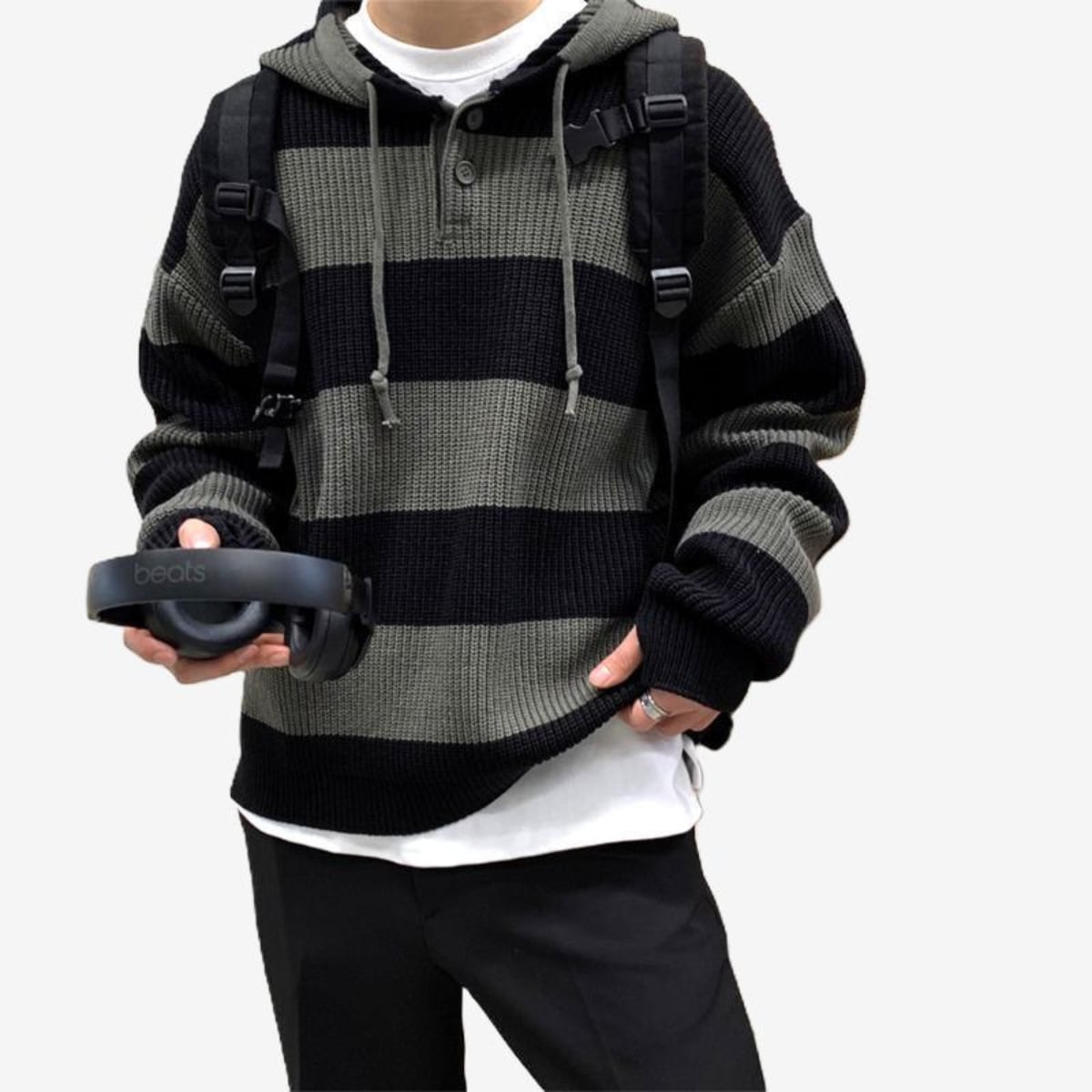フードとヘンリーネックの組み合わせがこなれた抜け感をつくり、レイヤードしたときのインナーを程よくアクセントにすることで、ぐっとおしゃれ感が出ます。