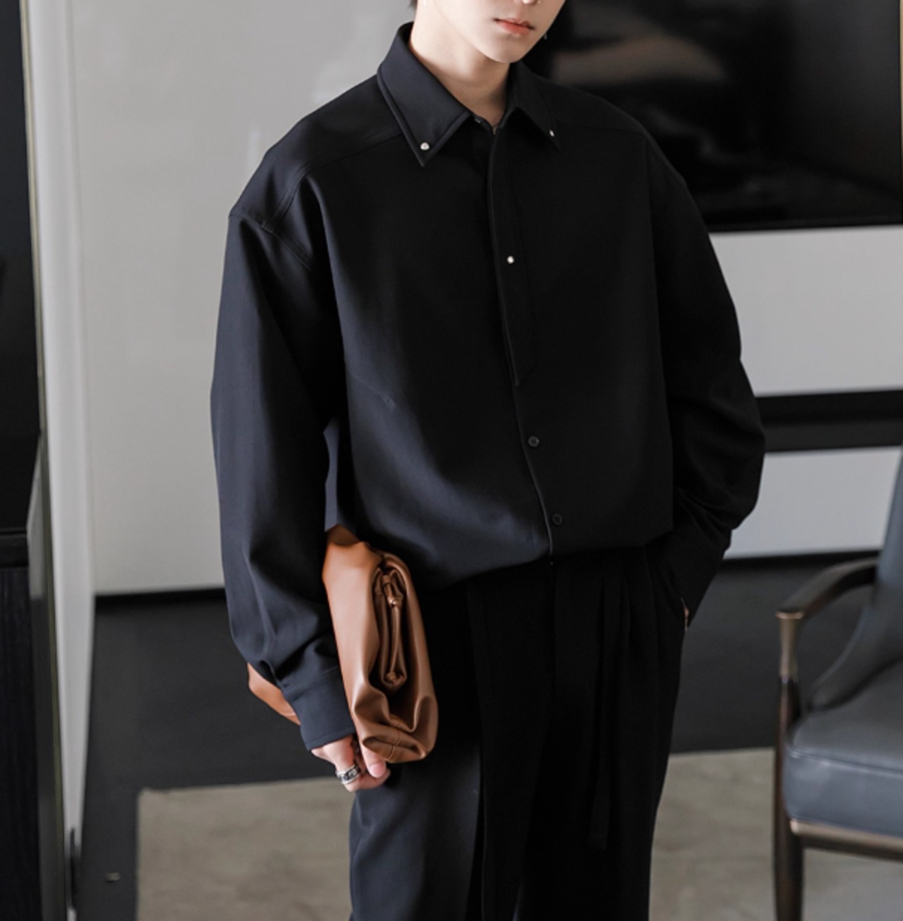 きれいなシルエットが出るように計算されたシャツは、1枚で着てもスウェットなどとレイヤードしてもGood!