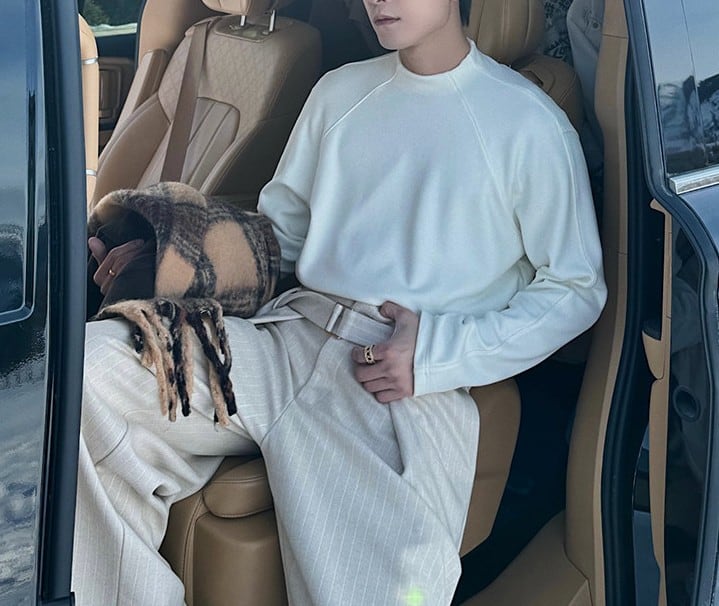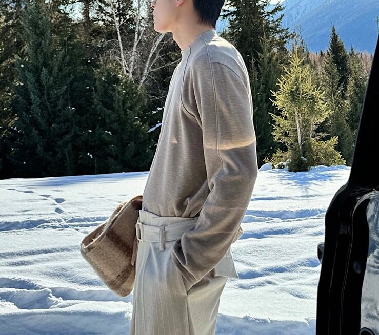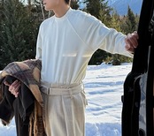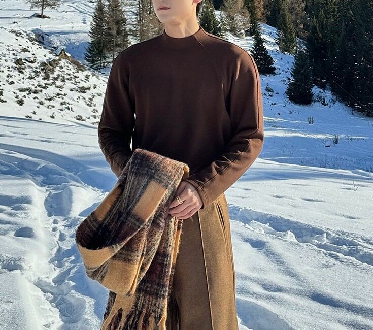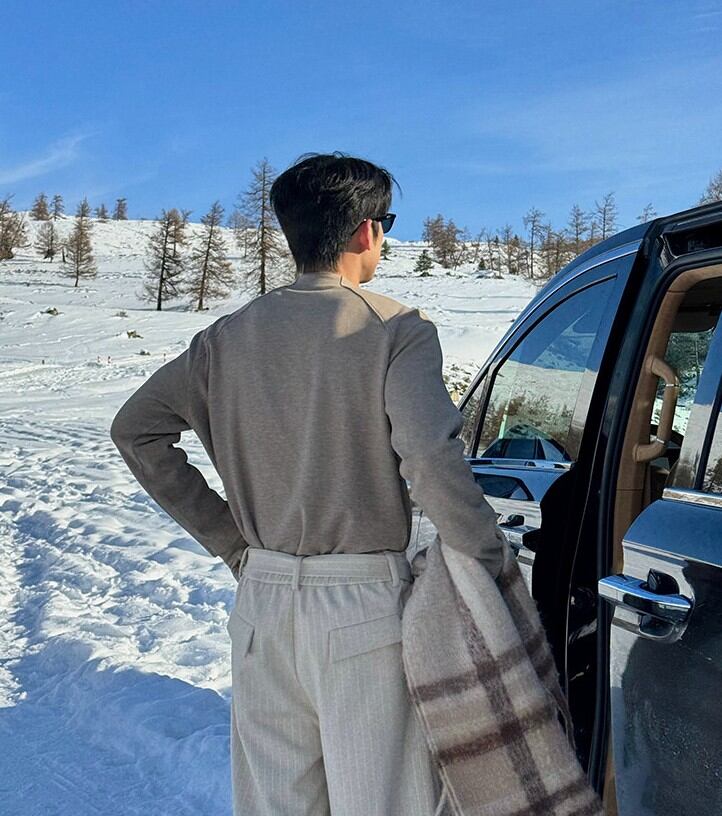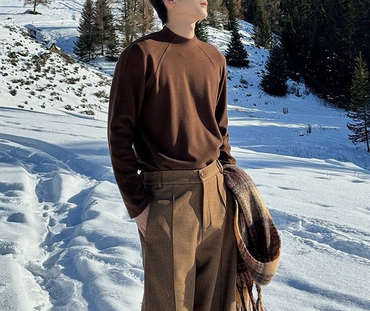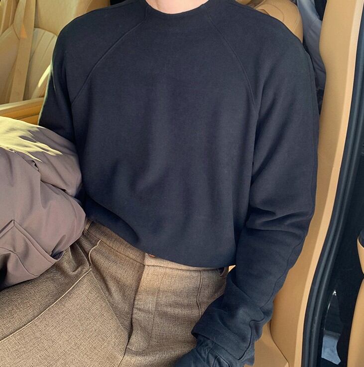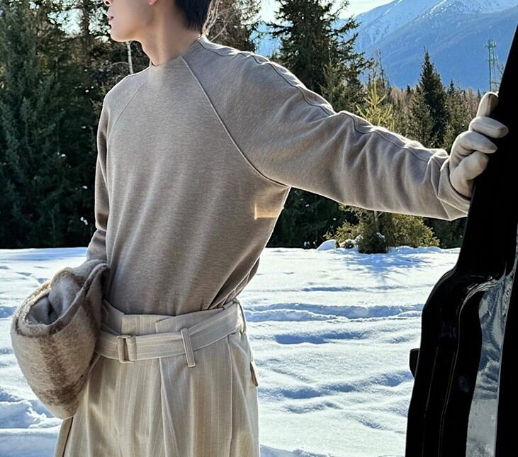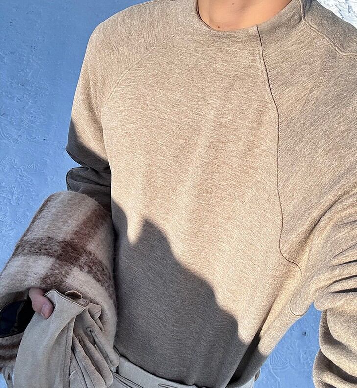 ラグランスリーブによる柔らかな肩のラインは、体を大きく見せず、それでいて男性らしい輪郭を残します。