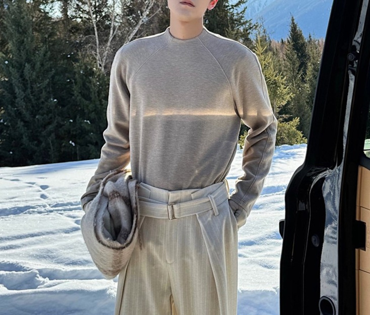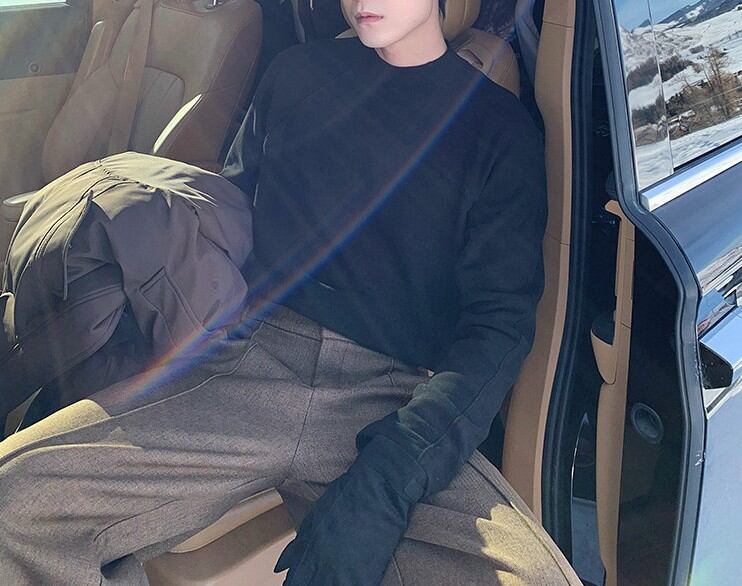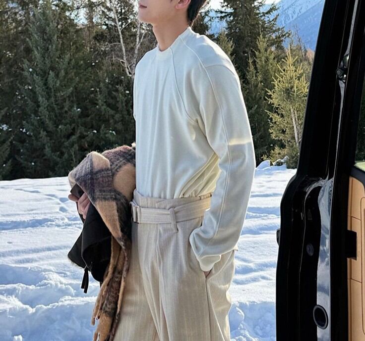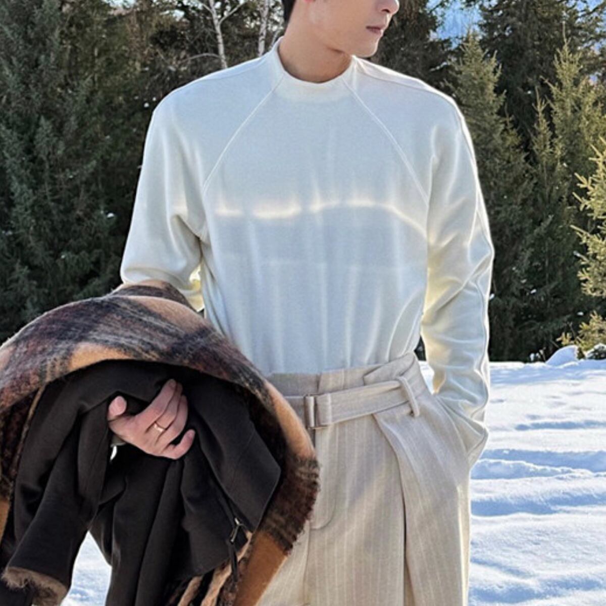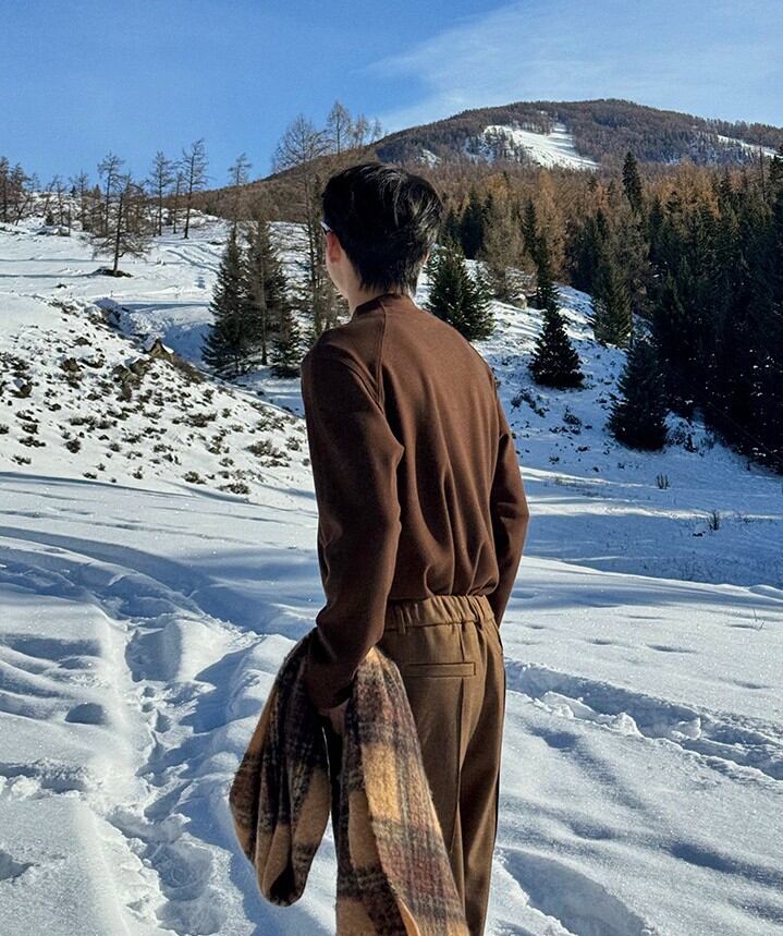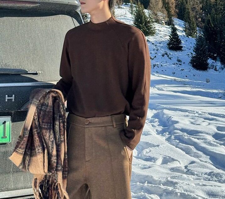ラグランスリーブによる柔らかな肩のラインは、体を大きく見せず、それでいて男性らしい輪郭を残します。