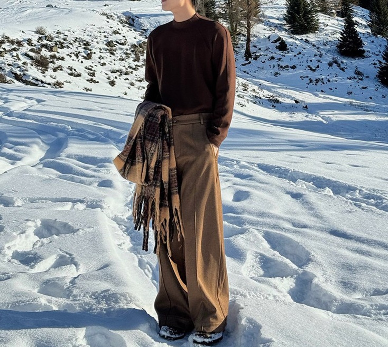 首元は詰まりすぎず、緊張感と抜け感のバランスがちょうどいいモックネックニット。