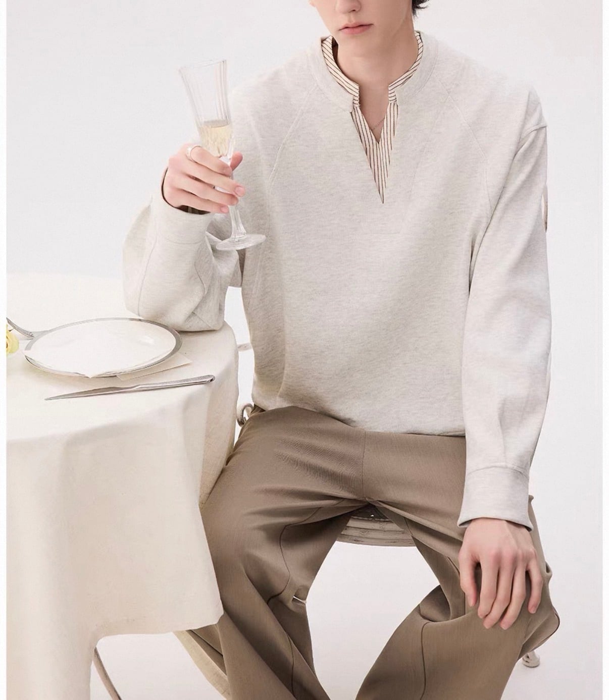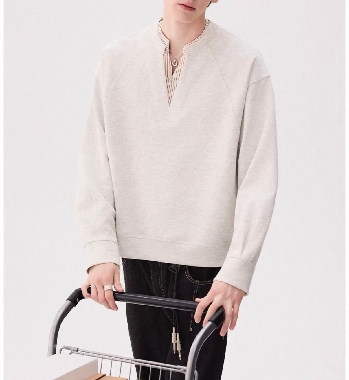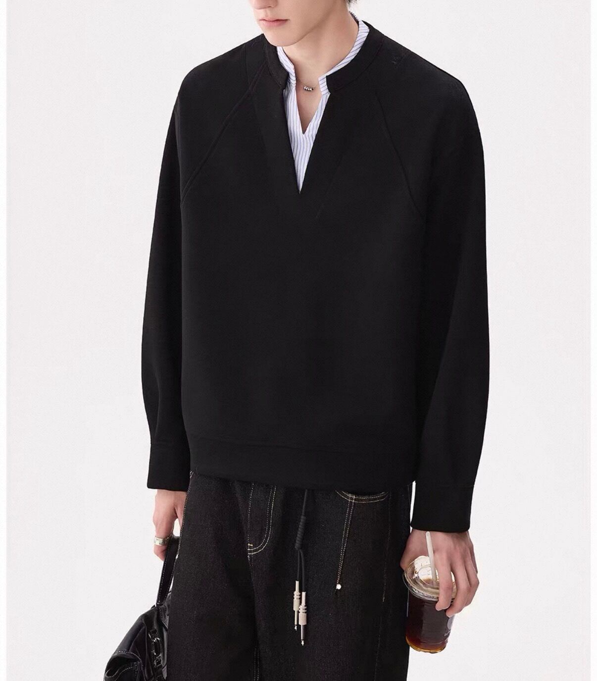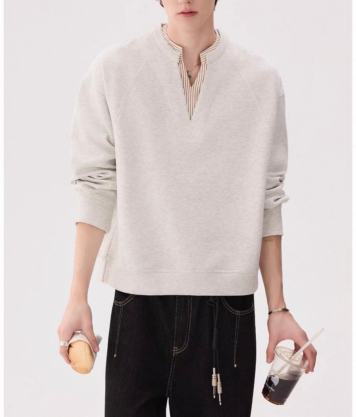 深めのVネックから覗くストライプシャツが、“抜け感”をつくるレイヤードトップス。