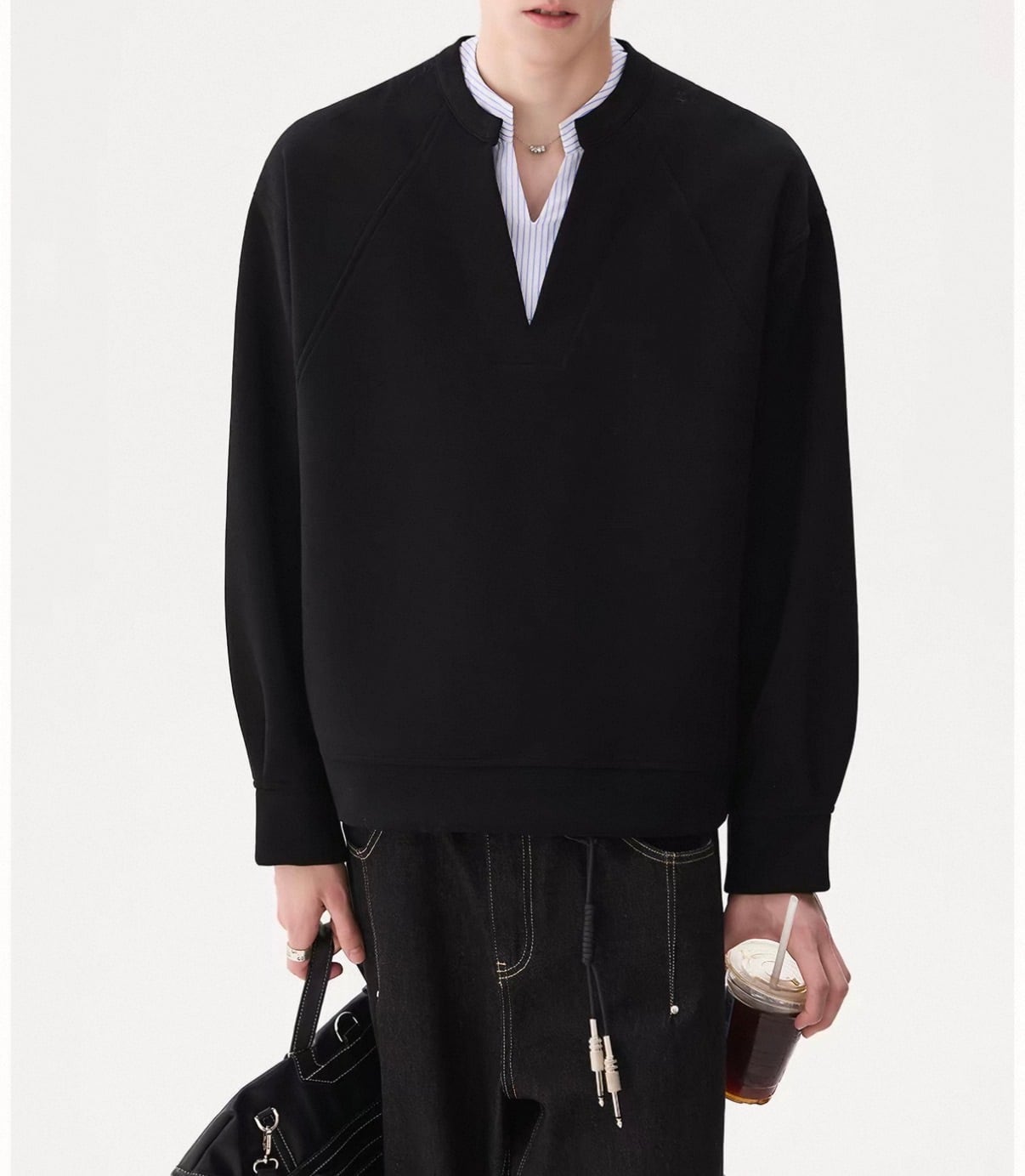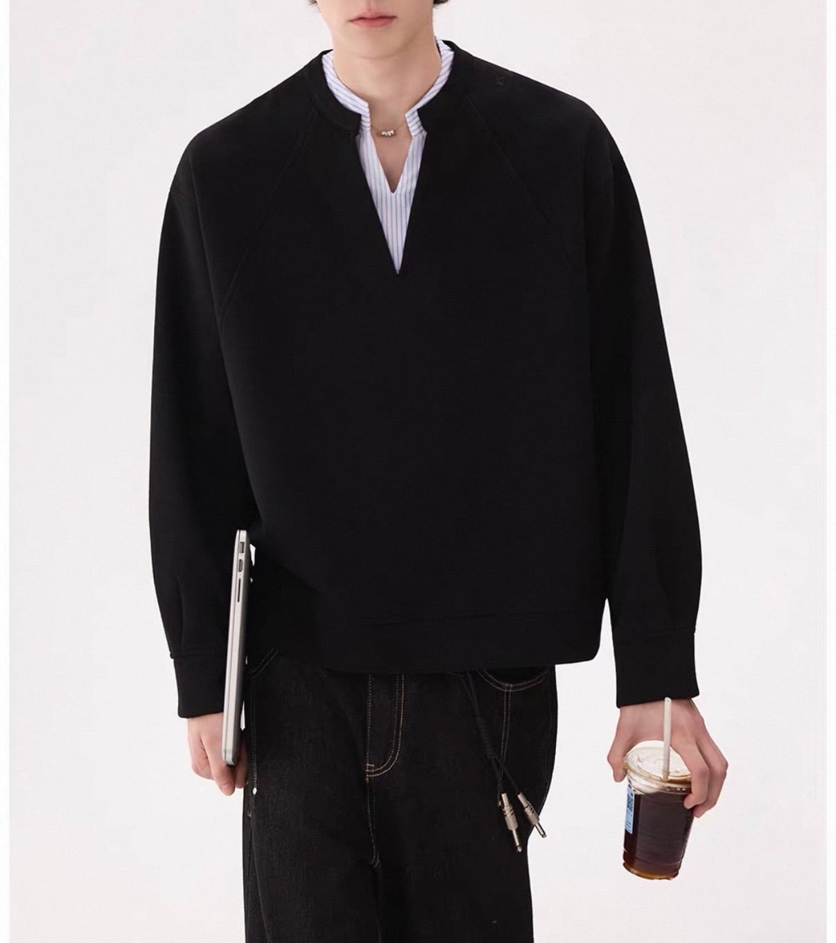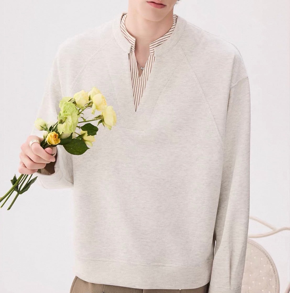 深めのVネックから覗くストライプシャツが、“抜け感”をつくるレイヤードトップス。