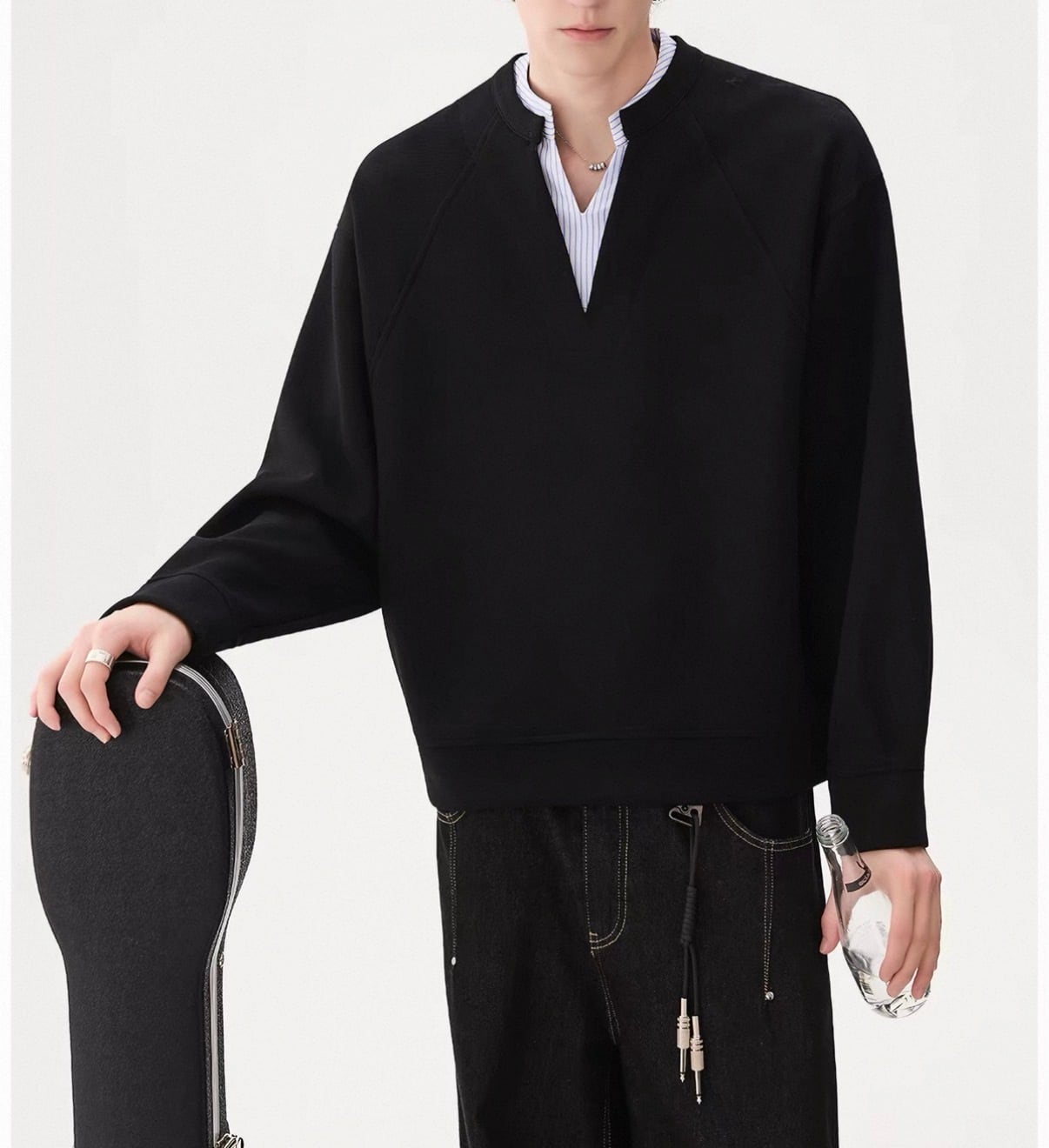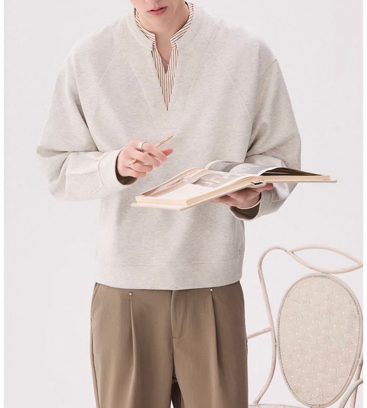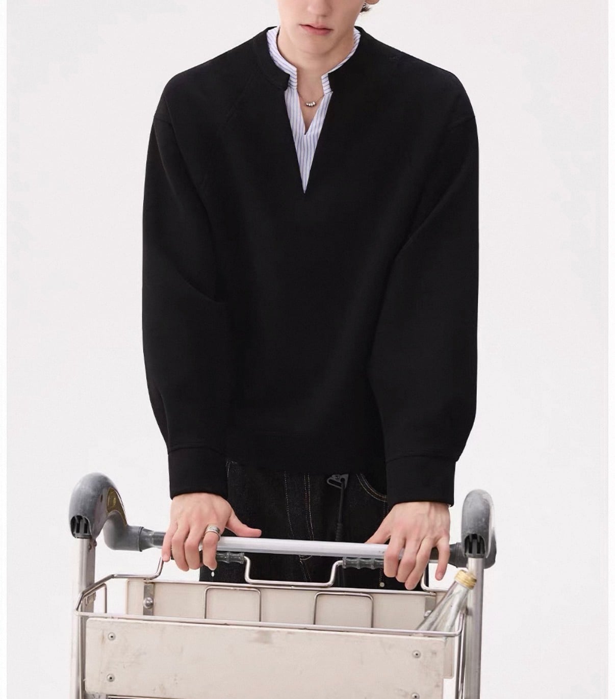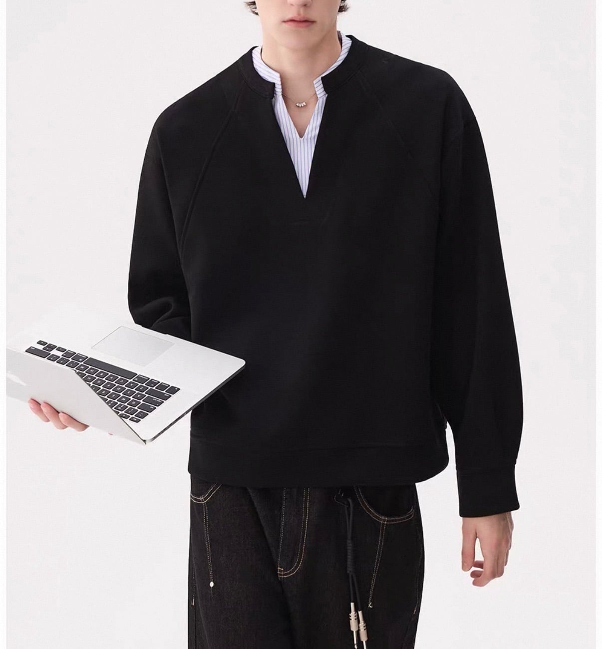 深めのVネックから覗くストライプシャツが、“抜け感”をつくるレイヤードトップス。