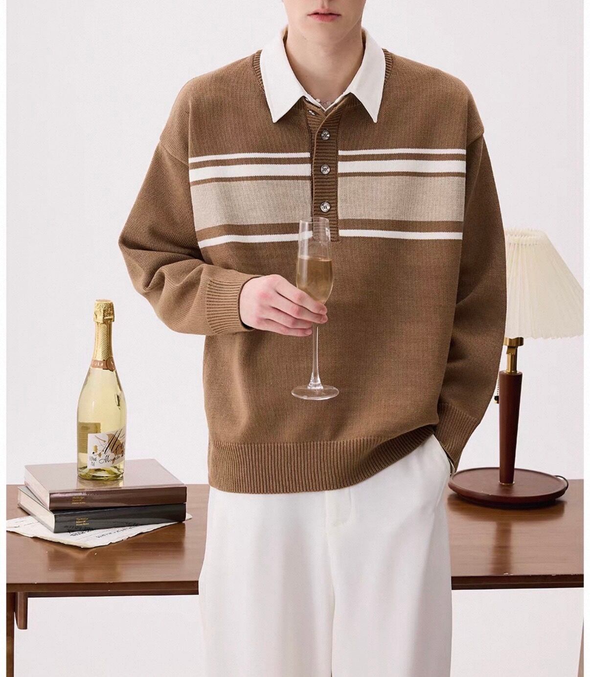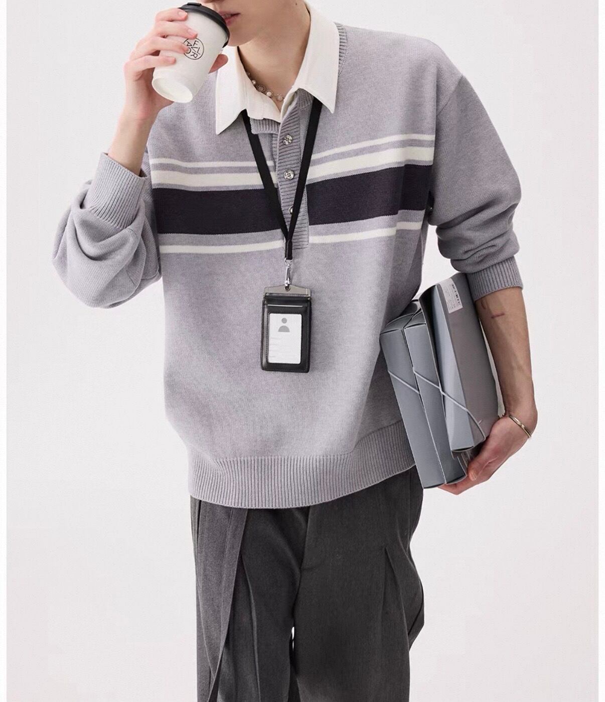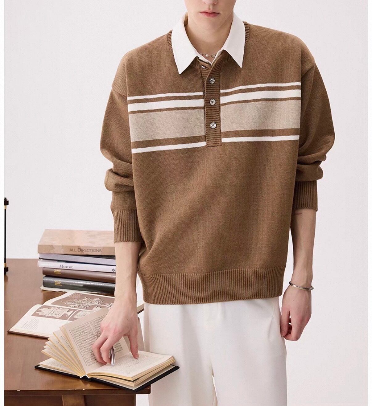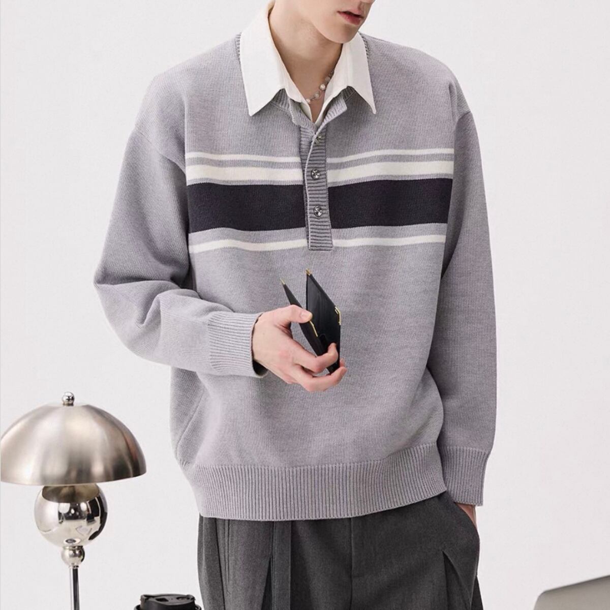白襟と胸元のボーダーラインがアクセントになったカジュアルニット。
