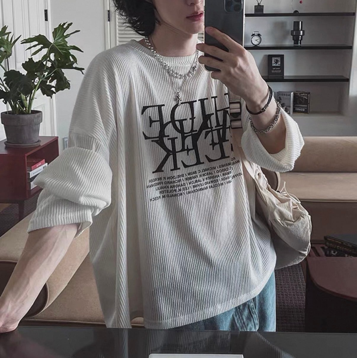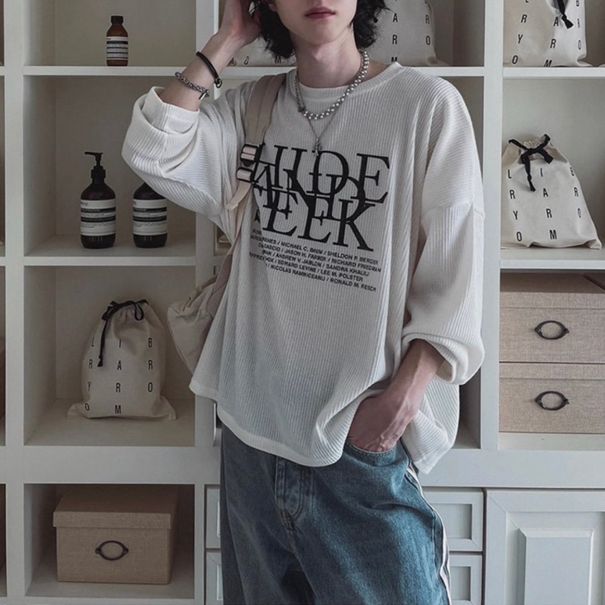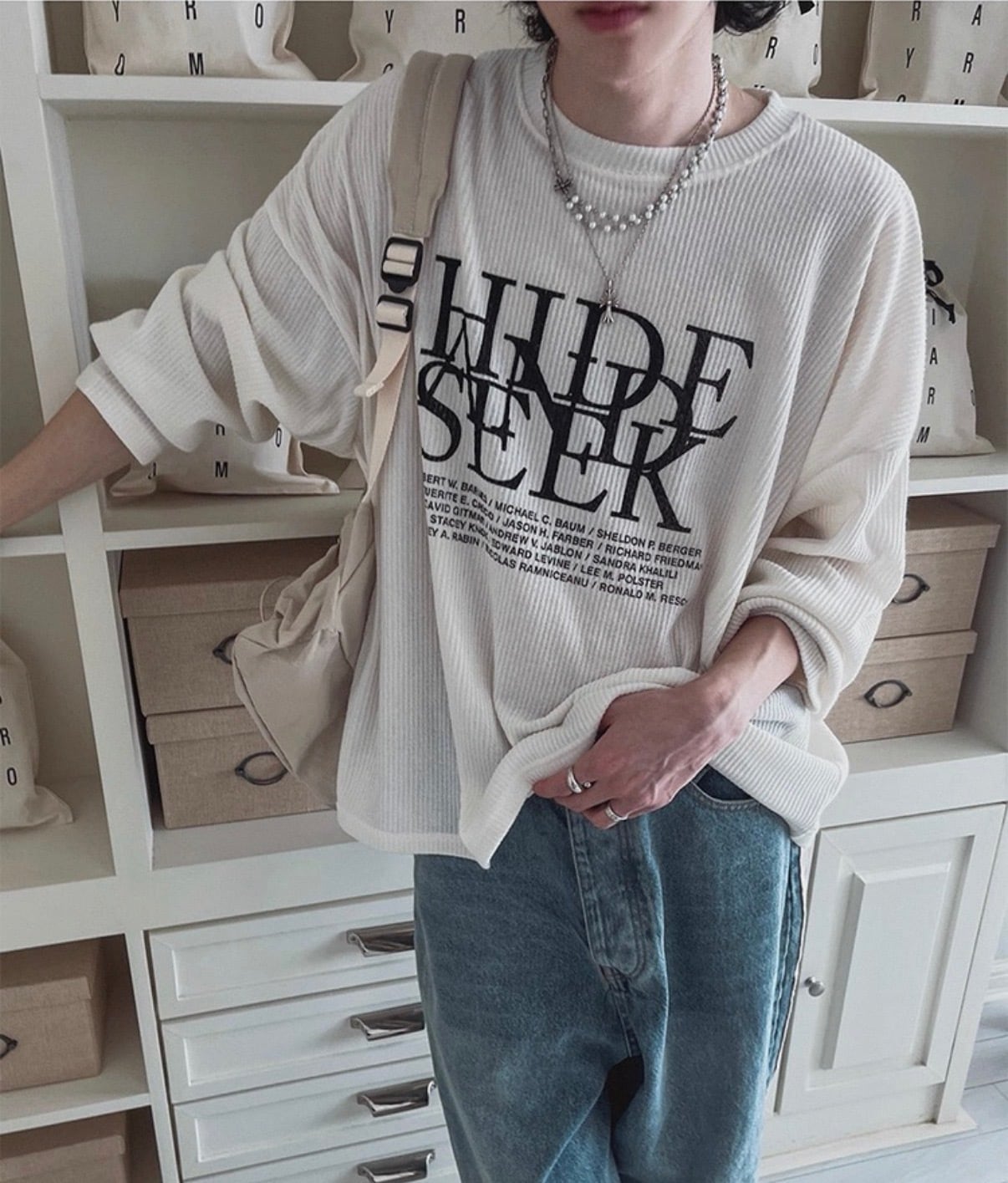 フロントに大胆なタイポグラフィを配し、細かなテキストをレイアウトしたデザインロングスリーブ。