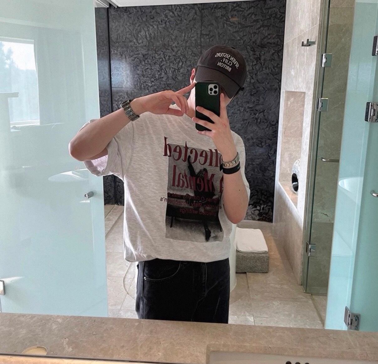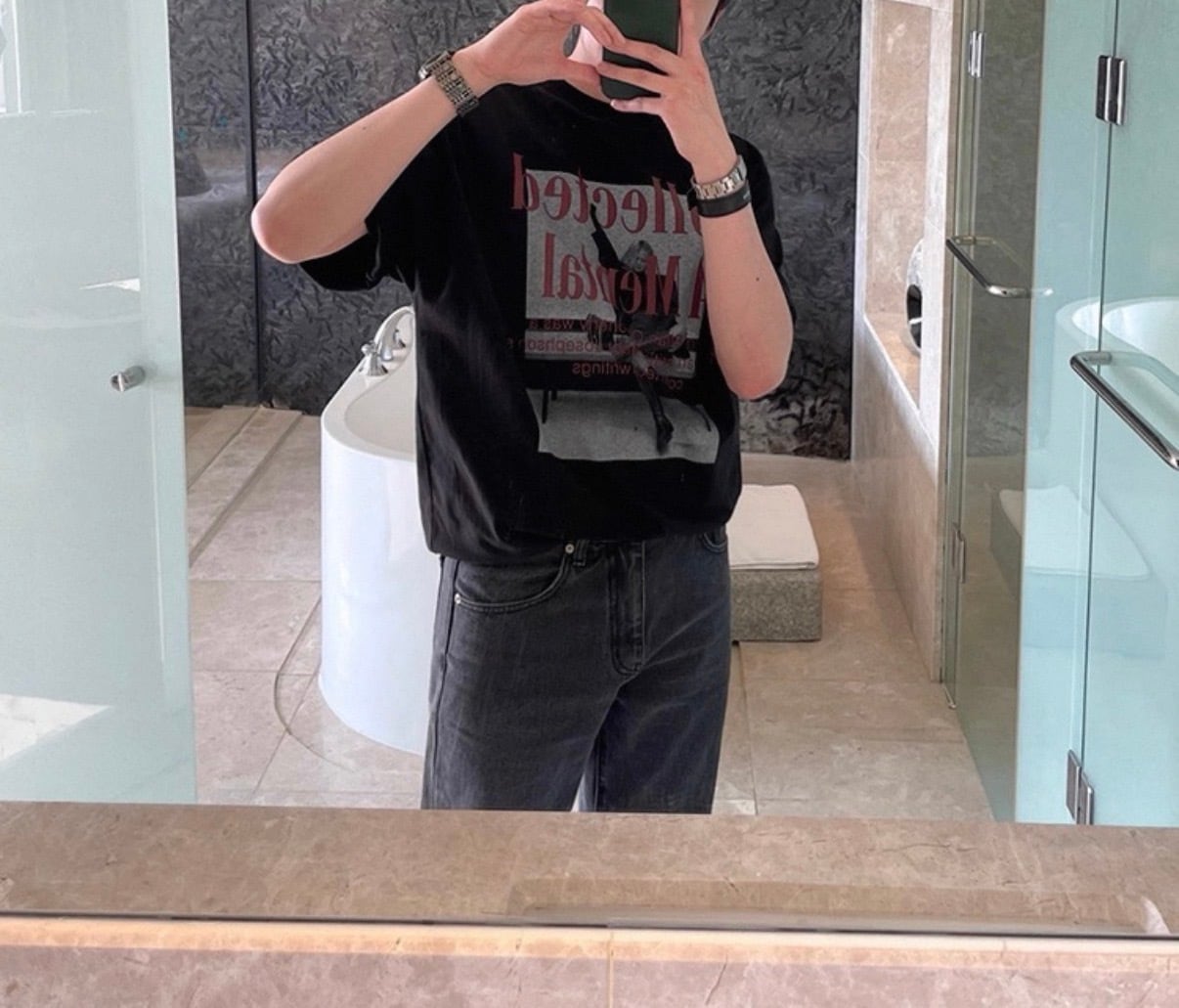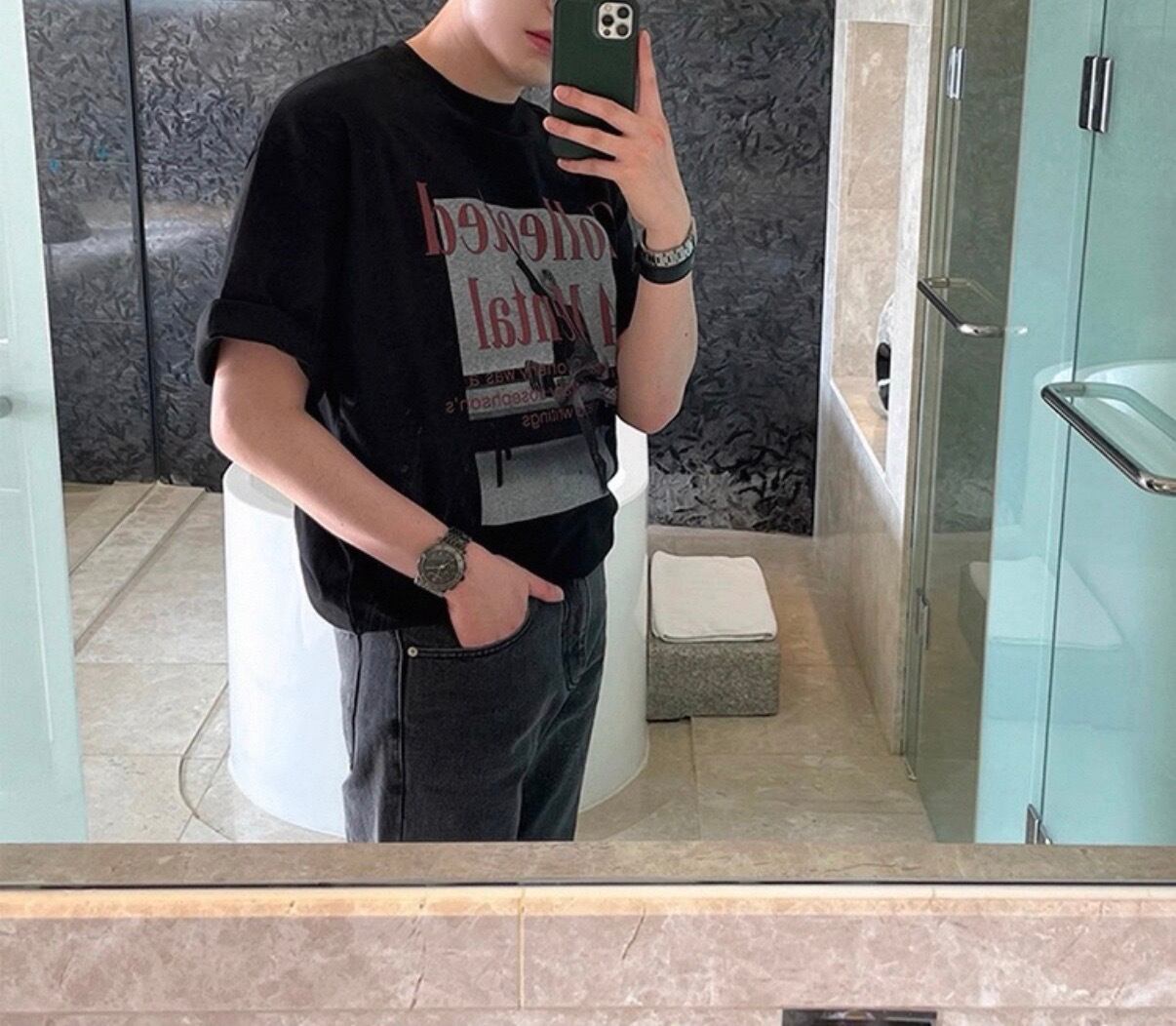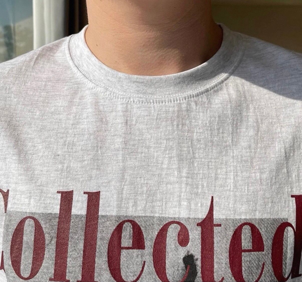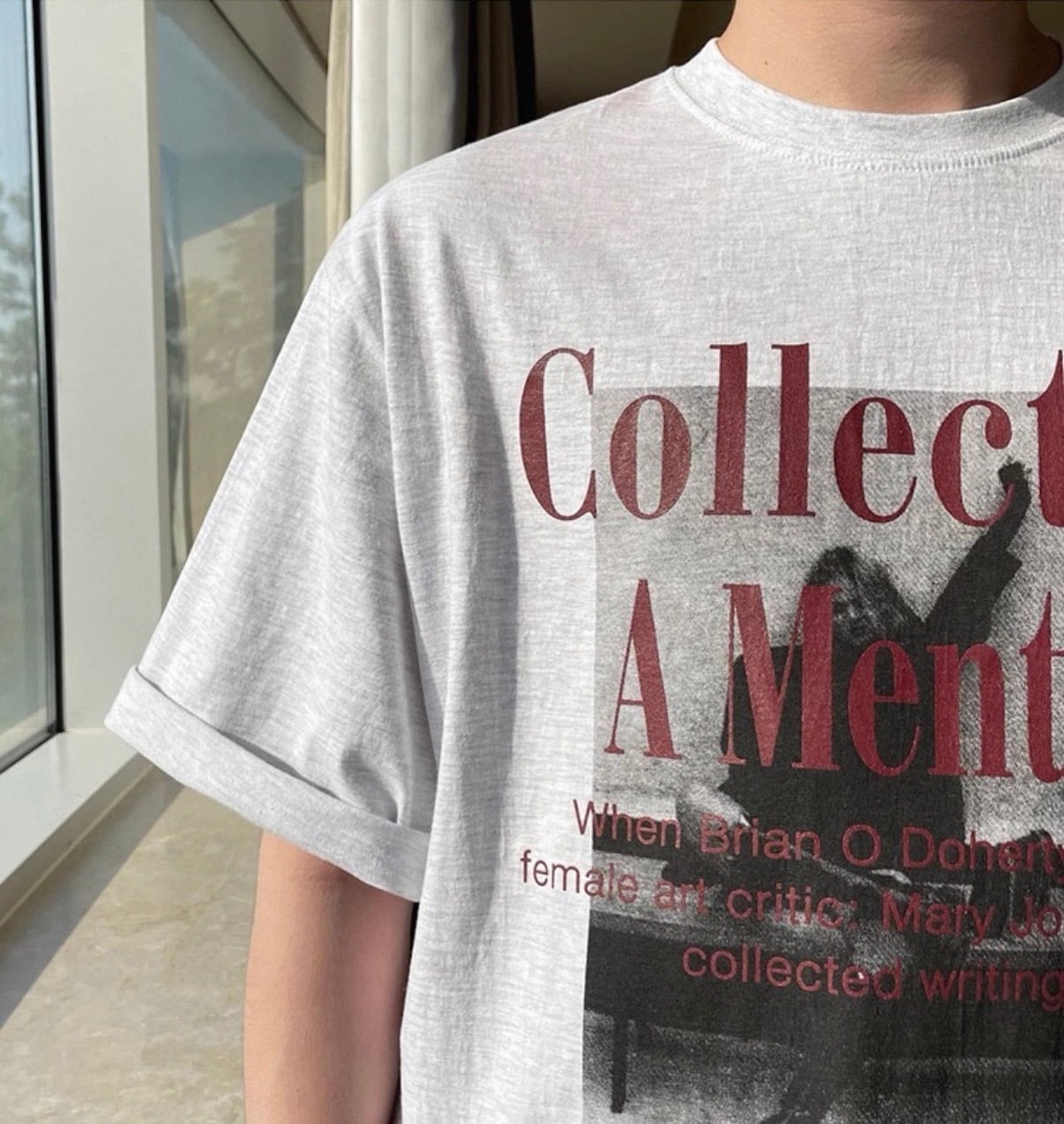 胸元にさりげなく配置されたテキストが、シンプルな中に知的なムードを添えるTシャツ。