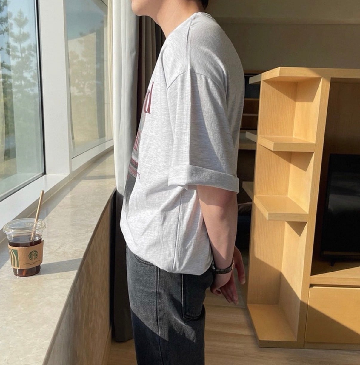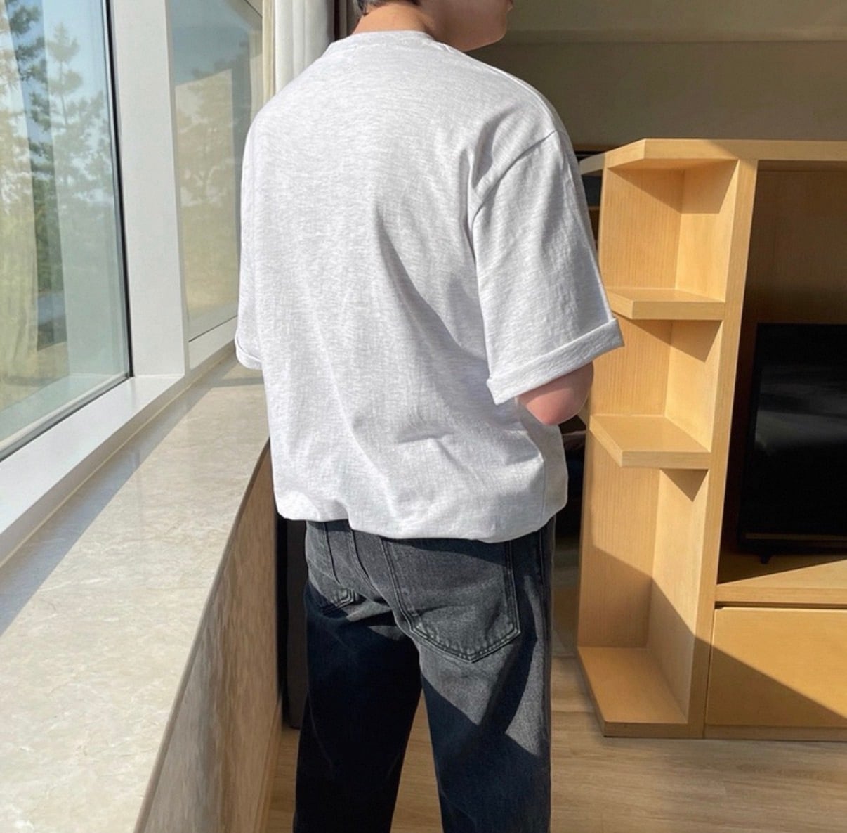 柔らかな素材感が自然光に映え、ラフに着ても上品さを失わないバランスに仕上がっています。
