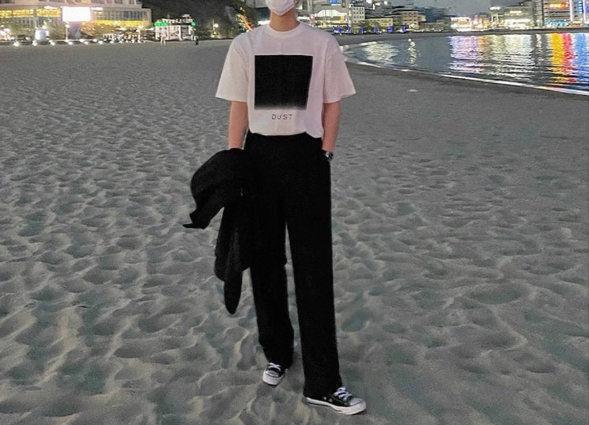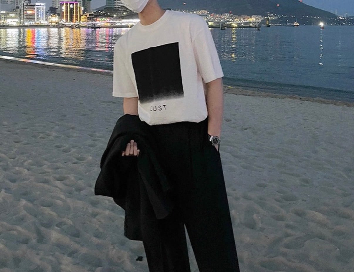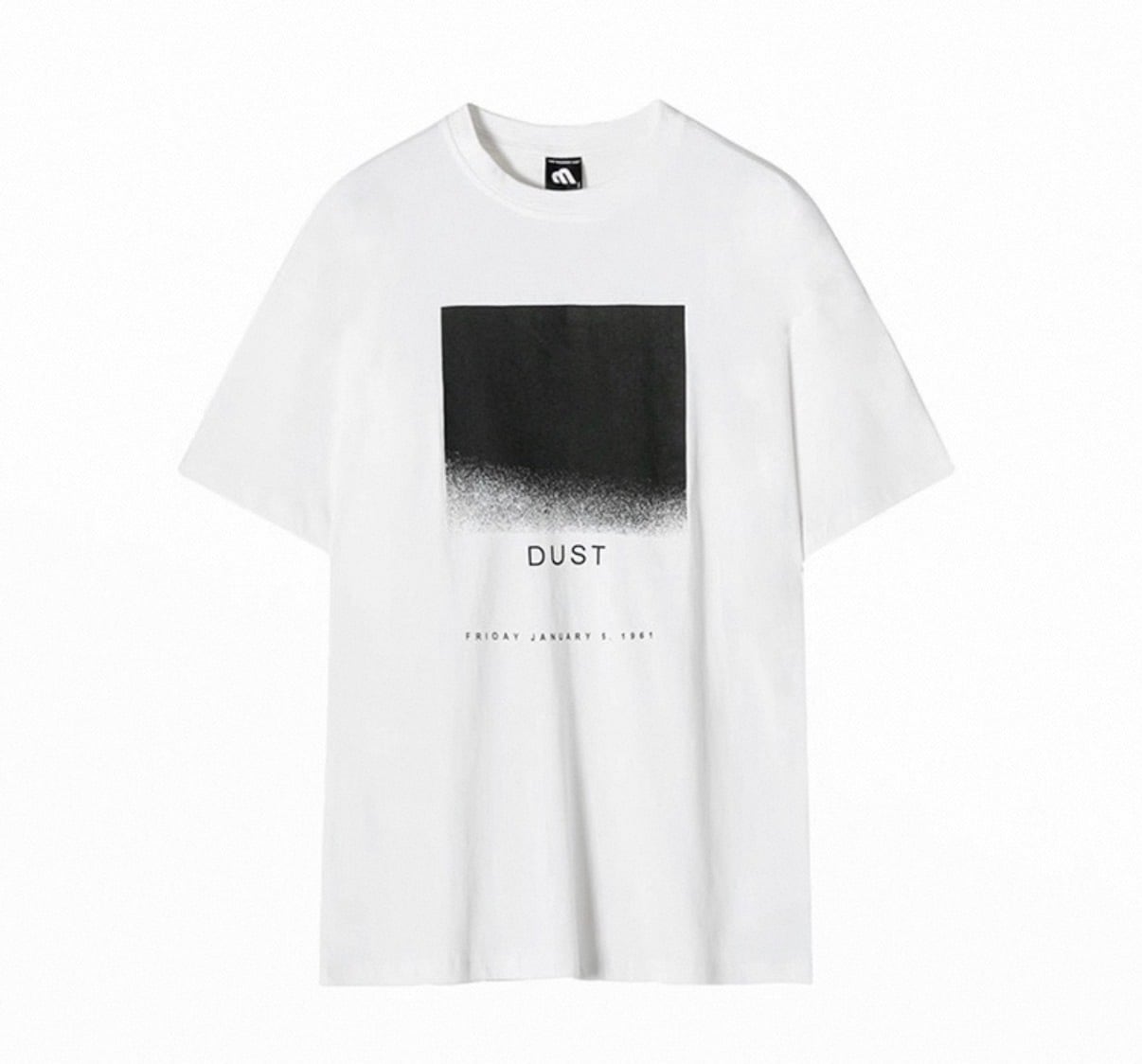 フロントに配置されたスクエアグラフィックが、静かなムードを漂わせるミニマルデザインTシャツ。