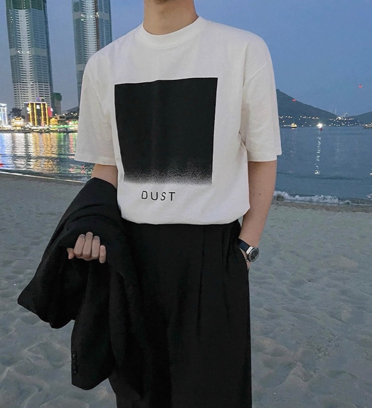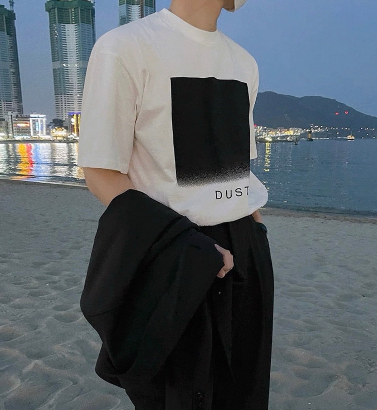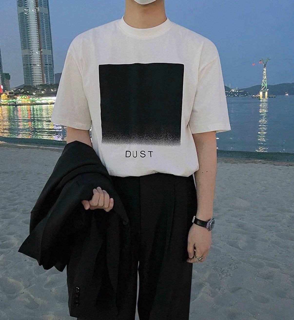 フロントに配置されたスクエアグラフィックが、静かなムードを漂わせるミニマルデザインTシャツ。